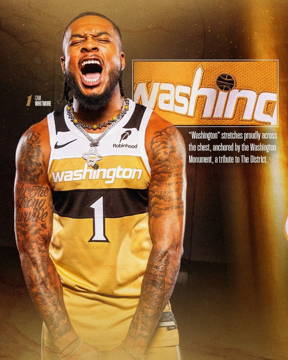 On September 24th Beijing time, the Wizards revealed their new city edition gold jersey for the upcoming season. Whitmore, nicknamed the "White Demon," showcased the No. 1 jersey, wearing sunglasses and standing prominently in the middle with a strong, confident aura. American media regard Whitmore’s move to the Wizards as one of the most overlooked signings of the summer. Given his potential and how a change of scenery might advance his career, the Wizards appear to be an ideal destination for him.