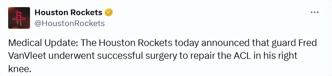On September 26 Beijing time, the Rockets officially announced that VanVleet underwent successful surgery today to repair his right knee anterior cruciate ligament. Previous reports indicated he is likely to miss most of the 2025-26 season, and possibly the entire season. VanVleet suffered the severe ACL tear during the team’s mini-camp held in the Bahamas.