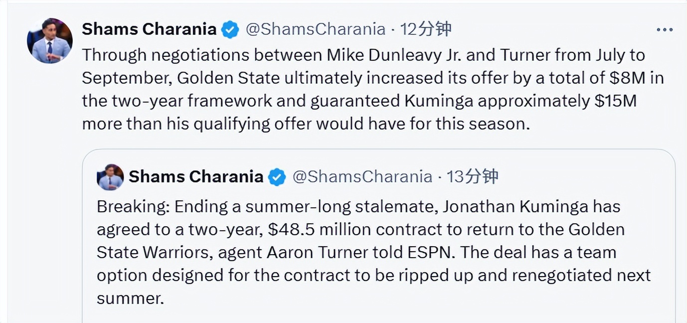 On October 1st Beijing time, agent Allen Turner revealed to ESPN that Kuminga has resolved a lengthy summer negotiation standoff and accepted a two-year, $48.5 million contract to rejoin the Golden State Warriors. This deal features a team option designed to give the team flexibility to end the contract and reopen talks next summer.