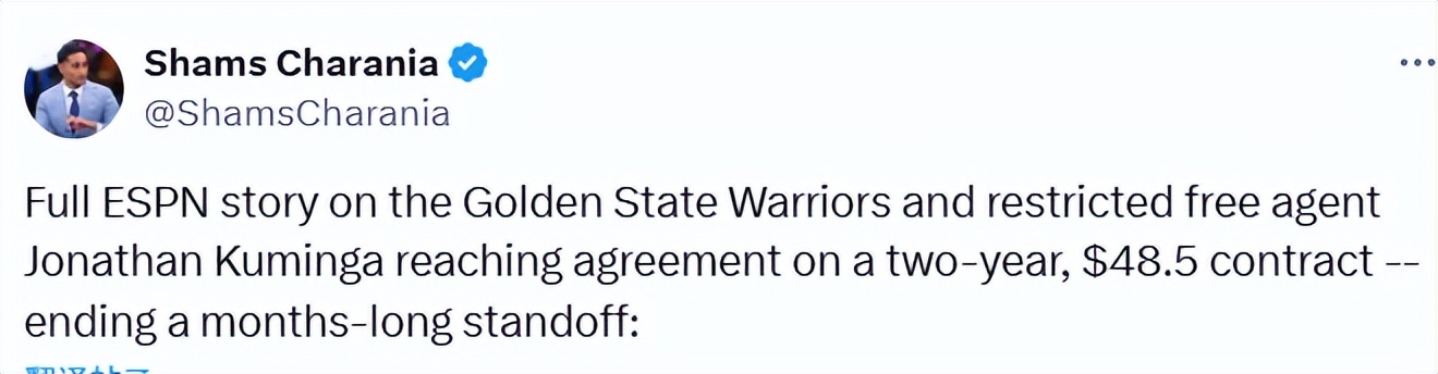 On October 1st Beijing time, Shams reported that restricted free agent Jonathan Kuminga agreed to a two-year, $48.5 million contract to return to the Warriors, Verus Basketball agent Aaron Turner told ESPN. Sources revealed the deal includes a team option for the second year, designed specifically for the Warriors—or if Kuminga is traded in the upcoming season, the acquiring team can also terminate the contract after the 2025-2026 season and negotiate a new one.