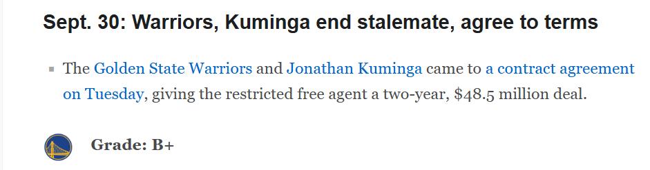 On October 1st Beijing time, the Warriors finalized a 2-year, $48.5 million contract with Kuminga, including a team option for the second year. Here is ESPN’s detailed analysis giving it a B+ grade—