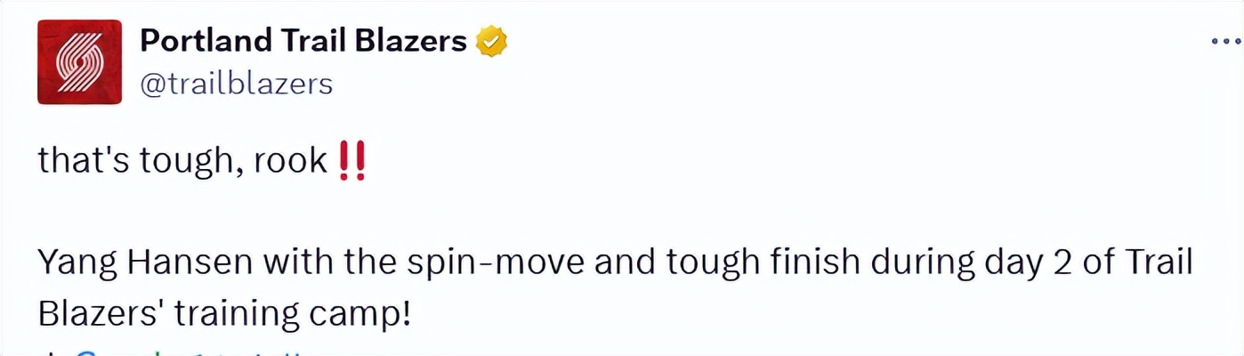 On October 2nd, during the Trail Blazers' second day of training camp, the official social media posted a clip of Yang Hansen’s basket. He backed down his defender, spun quickly toward the basket, and completed an impressive 2+1, earning cheers from his teammates. The official caption stated: “Very aggressive, rookie! Yang Hansen scored with a spin move and a powerful finish on day two of training camp!”