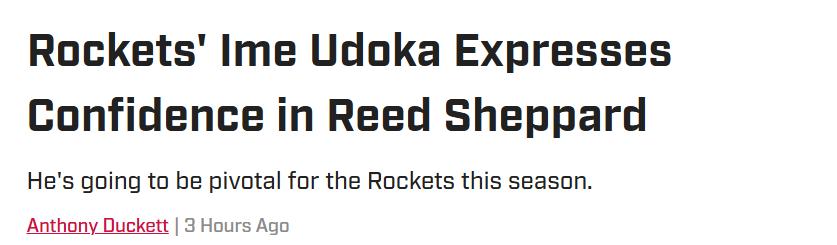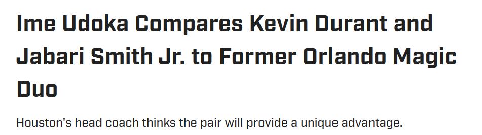 On October 2nd Beijing time, Rockets head coach Udoka gave an interview where he commended Shepard’s progress, believing he can partially fill the gap left by VanVleet’s absence. Additionally, Udoka spoke about Durant and Jabari Smith Jr., saying this pairing reminds him of the former Magic duo Tecoglu and Lewis.