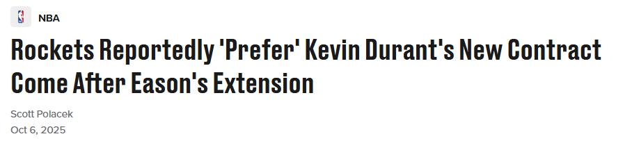 On October 6th Beijing time, NBA reporter Jake Fischer stated that the Rockets are leaning towards completing Eason’s extension first, then finalizing a two-year contract with Durant. The Rockets hope to clarify their financial commitments after Eason’s renewal. A week ago, Fischer also reported that the general consensus was Durant would eventually re-sign with the Rockets, while Eason’s chances of extension seemed less certain than Durant’s.
