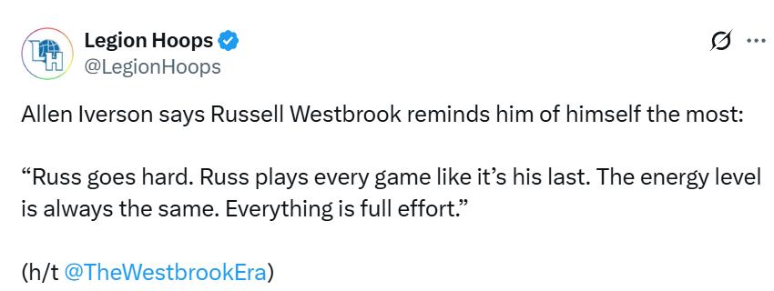 Former NBA star Allen Iverson recently spoke about Westbrook on a show, saying he is the current player who reminds him most of himself. “He plays with relentless effort, giving everything as if every game is his last. His energy remains consistent, and he always puts in full effort in everything he does.”