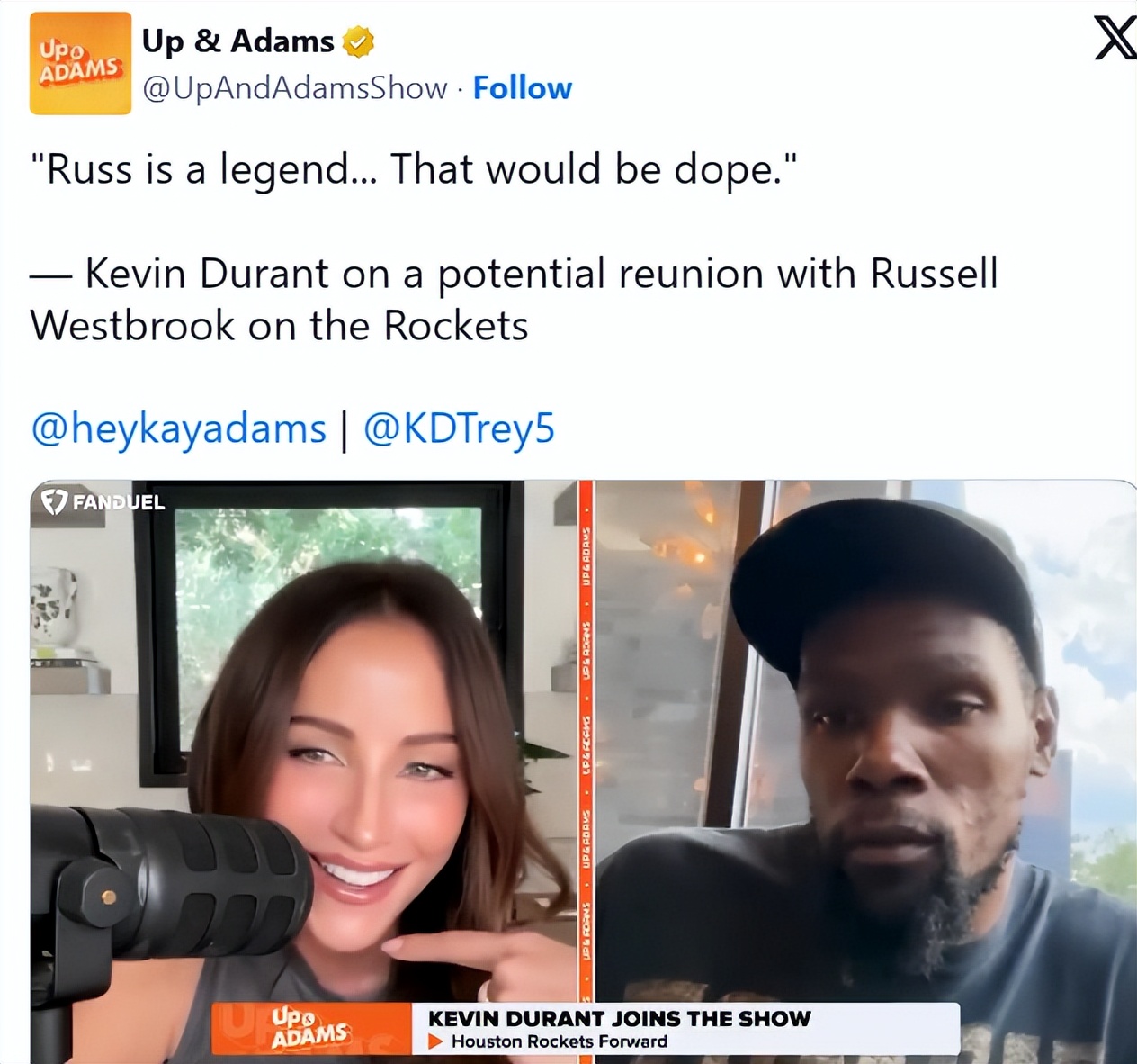 On October 9th Beijing time, Rockets star Kevin Durant expressed that Russell Westbrook "deserves" to stay in the NBA, and that it would be "wonderful" if they could reunite on the Rockets.