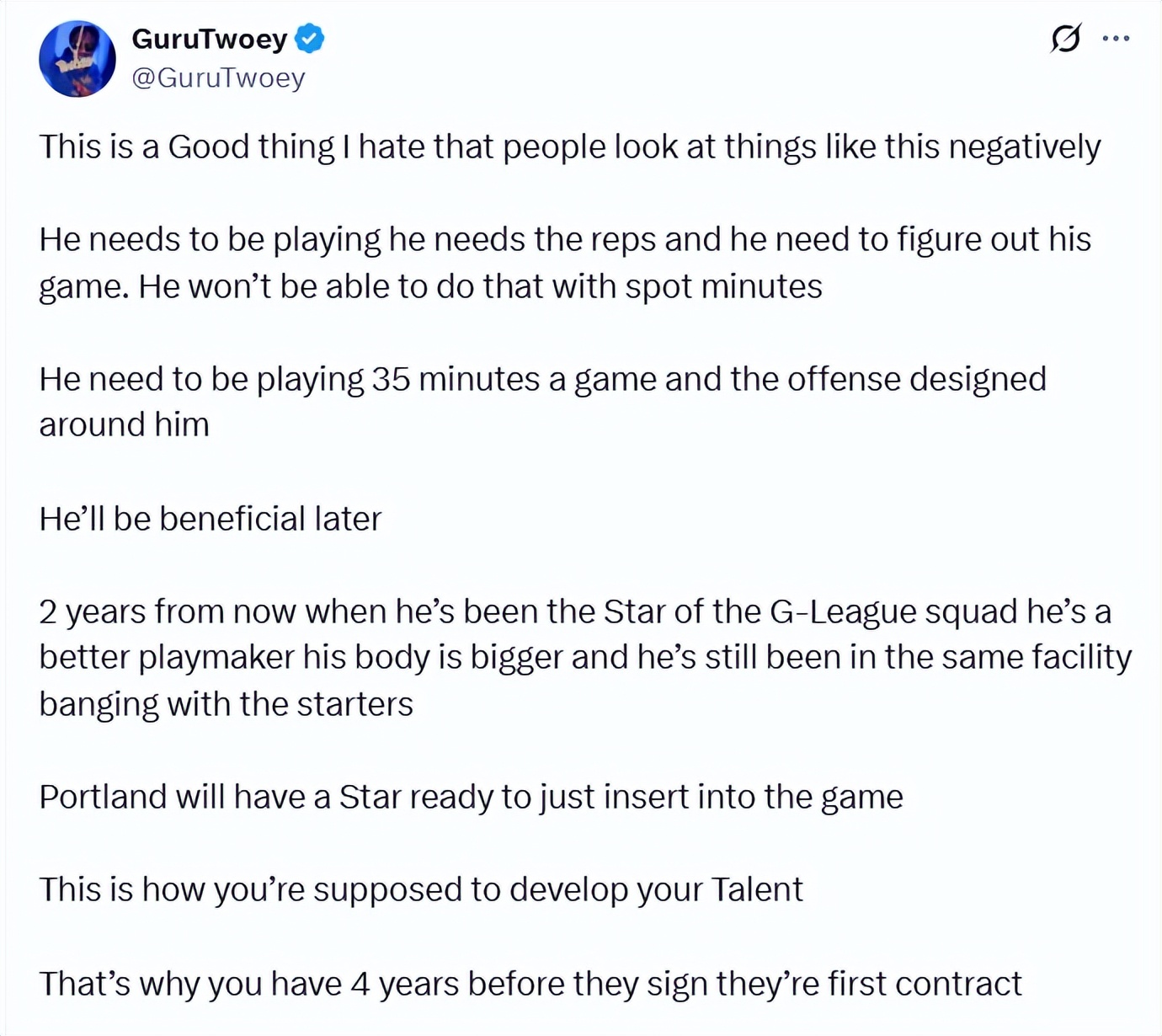 Fan GuruTwoey commented: "This is absolutely positive. He needs more playing time now and enough minutes on the court to find his own rhythm. Sporadic appearances won’t achieve that. He should be playing 35 minutes every game, and the team should build their offense around him. He will definitely become very useful. In two years, when he becomes a core player in the G League, his passing will improve, his body will get stronger, and during this time he can keep training at the Trail Blazers’ facility alongside the main roster. Then the Trail Blazers will have a star ready to step onto the court anytime. This is how rookies should be developed. Otherwise, why do rookie contracts last four years for growth?"