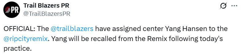 On November 5th Beijing time, the Trail Blazers officially announced that they had sent Yang Hansheng to the G League team Rip City Remix. Following today’s practice, Yang will be recalled from the Remix. This means his second assignment was a same-day trip, while his first assignment involved two days of training with the Remix.