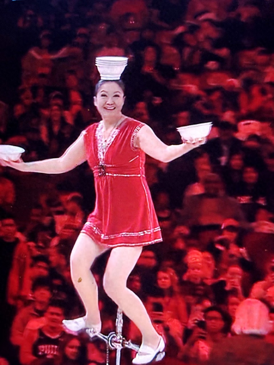 Niurong’s signature act involves riding a unicycle while balancing specially designed colorful bowls on her calves, then flipping the bowls up to her head.