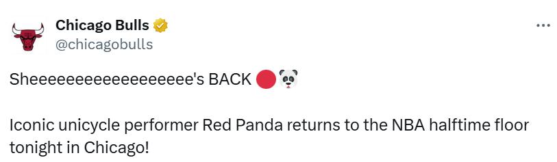 Before the game, the Bulls’ official account announced that the legendary unicycle performer "Red Panda," who was previously injured during a show, would make her return to the NBA stage today with a halftime performance in Chicago. In the video, "Red Panda" greeted everyone wearing the iconic Jordan number 45 jersey, while the Bulls’ official mimicked Jordan’s comeback message with the caption: "She’s back!"