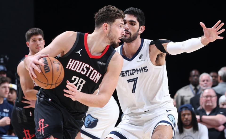 Rockets: Amen 28 points, 10 rebounds, 7 assists; Sengun 20 points, 16 rebounds, 7 assists, 6 turnovers; Smith Jr. 16 points, 4 boards; Okogie 13 points, 3 rebounds, 3 assists; Durant 11 points, 4 rebounds, 5 assists; Eason 16 points, 5 rebounds; Shepard 12 points; Capela 6 points, 10 rebounds