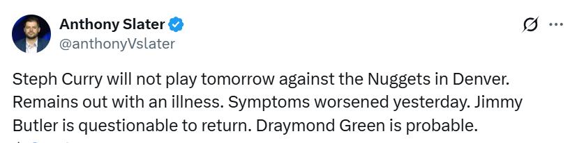 On November 7th Beijing time, according to Warriors reporter Slater, Curry will not play tomorrow against the Denver Nuggets. He missed the previous game against the Kings due to a cold, which worsened yesterday. Butler's participation remains uncertain (50% chance), but Draymond is highly likely to play.