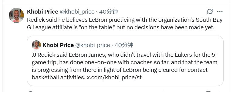 Coach Reddick provided an update on James after practice. He revealed that James, who did not join the Lakers on their five-game road trip, has already had one-on-one training sessions with the coaching staff. Since James has been cleared to participate in competitive basketball activities, the team is gradually advancing his rehabilitation based on this. Reddick also mentioned that he believes it is “possible” for James to practice with the affiliated G League team, the South Bay Lakers, but no final decision has been made yet.