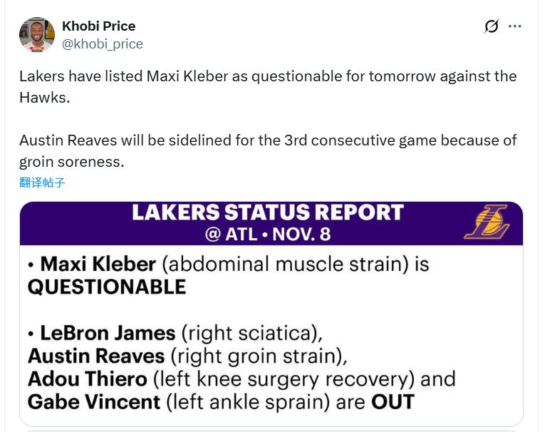 On November 8th Beijing time, the Lakers released their latest injury update for the upcoming game against the Hawks. Reeves is sidelined for the third consecutive game with a groin strain. James, Thybulle, and Vincent will also miss this match. Kleber’s participation is uncertain.