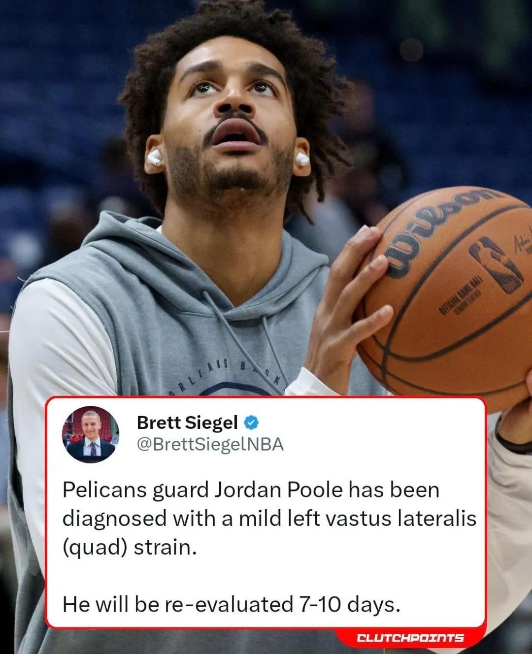 First, their interior star Zion is sidelined with a first-degree hamstring strain on his left leg (out for at least a week), and now their perimeter key player Poole has been hospitalized due to a mild strain of the left vastus lateralis muscle, with a re-examination scheduled in 7 to 10 days.