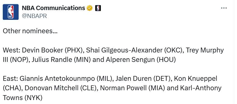 West: Booker (Suns), Alexander (Thunder), Murphy (Pelicans), Randle (Timberwolves), Sengun (Rockets)