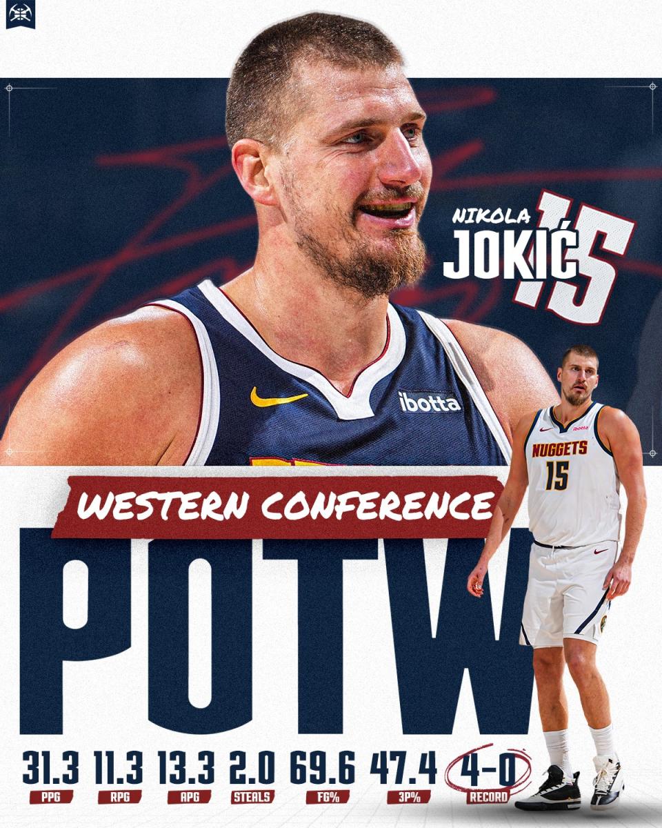 This marks Jokic’s first time winning the award this season, and the 18th time in his career he has been named Western Conference Player of the Week, ranking first in Nuggets history.