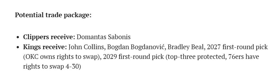 Kings receive: John Collins, Bogdan Bogdanovic, Bill, 2027 first-round pick (Thunder holds swap rights), 2029 first-round pick (top-three protected, 76ers hold swap rights for picks 4-30)