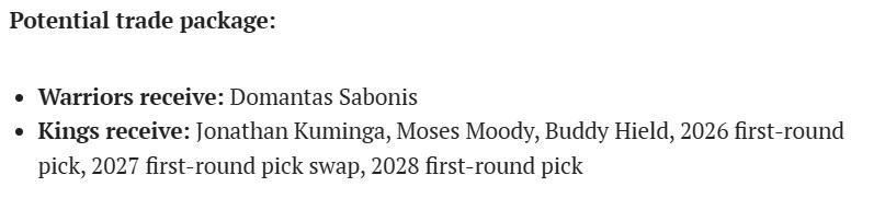 Kings receive: Kuminga, Moody, Hield, 2026 first-round pick, 2027 first-round pick swap rights, 2028 first-round pick