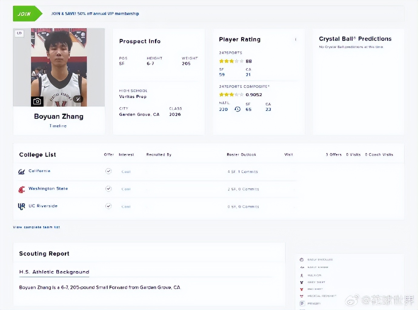 Back to the point, although Zhang Boyuan is currently rated as a three-star high school player with a score of 88, ranked 59th nationally as a small forward, if he continues to perform well, a four-star rating is within reach soon.