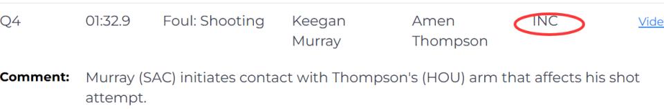 The second missed call happened with 1:32 remaining in the fourth quarter. Murray of the Kings made contact with Thompson’s arm during defense, disrupting Thompson’s shooting motion, which should have been called a defensive foul. This missed call favored the Kings and was detrimental to the Rockets.