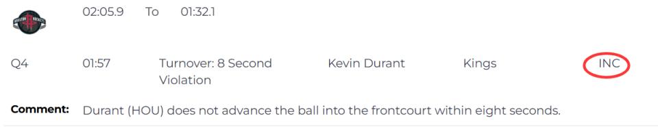The first missed call occurred with 1:57 left in the fourth quarter. The report indicated that Durant of the Rockets failed to advance the ball past midcourt within 8 seconds. This 8-second violation was overlooked, benefiting the Rockets while disadvantaging the Kings.