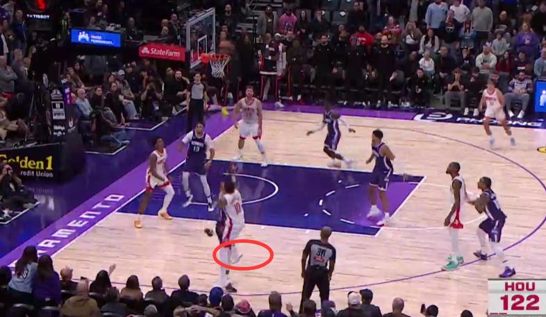 The fourth missed call was also overlooked, occurring with 1:13 left in overtime. Shengjing stayed in the restricted area for more than 3 seconds, which should have been called a three-second violation. This was missed, giving an advantage to the Rockets and a disadvantage to the Kings.
