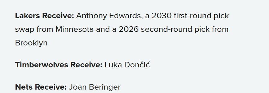 Lakers receive: Edwards, Timberwolves’ 2030 first-round pick swap rights, Nets’ 2026 second-round pick