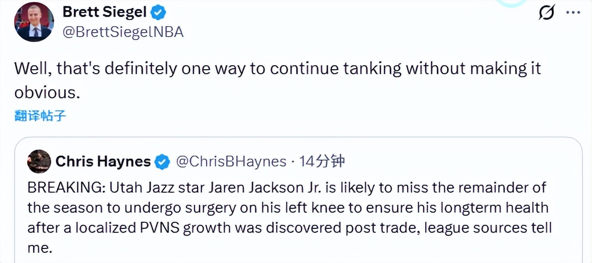 Insider Haynes stated that Jaren Jackson Jr. might miss the entire season due to this. Siegel reposted and commented, “Alright, this is definitely a less obvious but more reassuring way to tank.”