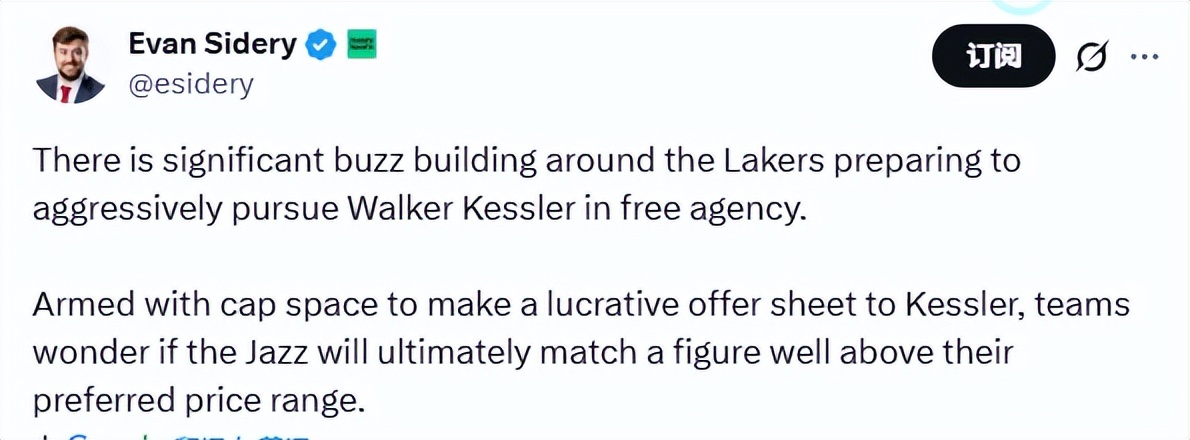 On February 13th Beijing time, according to insider Sidery, the Lakers are preparing to aggressively chase Jazz center Walker Kessler on the free agent market. The Lakers have ample salary cap space and can offer Kessler a lucrative qualifying offer. Many teams in the league are speculating whether the Jazz will ultimately match an offer far exceeding their valuation.