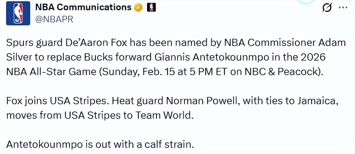 On February 13th Beijing time, the Bucks confirmed that Giannis will not participate in the All-Star Game. This news was expected, as he has been sidelined since suffering a right calf strain on January 24th. Giannis was originally selected for the World Team under the new three-team format.