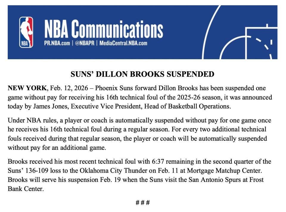 On February 13th Beijing time, as per the league’s official statement, Suns forward Dillon Brooks was handed a one-game suspension without pay due to reaching his 16th technical foul this season. He will lose $121,403 in salary, representing 1/174 of his $21,124,110 yearly income. The Suns will gain a 50% credit on the salary tax difference.