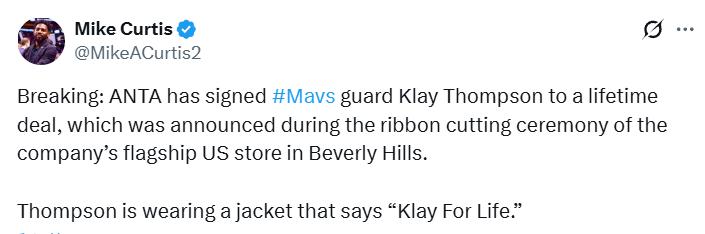 Reports indicate that during All-Star Weekend, Anta launched its first physical retail store in the U.S. At the event, Anta unexpectedly revealed the lifetime sneaker contract with Klay, which will last beyond his playing career, delighting the entire audience.