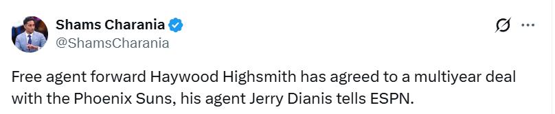 On February 15th Beijing time, insider Shams reported that the Suns will sign free agent forward Haywood Highsmith to a multi-year contract. Suns reporter John Gambadoro verified this information and mentioned that the second year of Highsmith’s deal includes a partial guarantee.