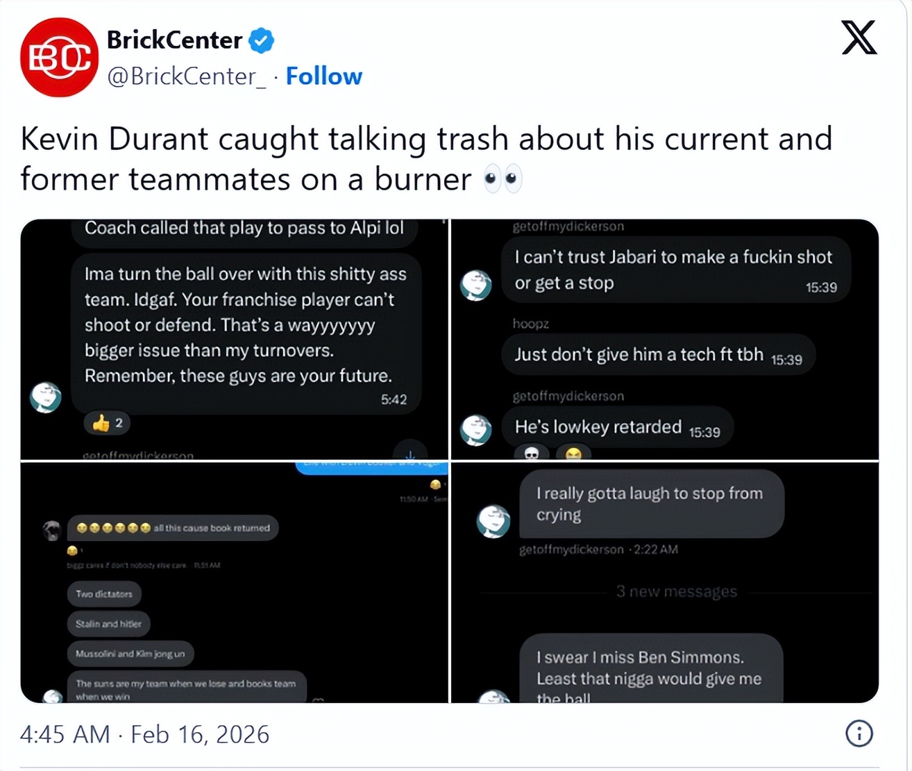 On February 17th Beijing time, Durant’s suspected alternate account caused a stir. The account reportedly criticized teammates from his Rockets and Suns days. Commentator Bill Simmons openly said that rumors don’t arise without cause. Some fake news outlets took advantage to spread false claims that the NBA would look into Durant’s alternate account.