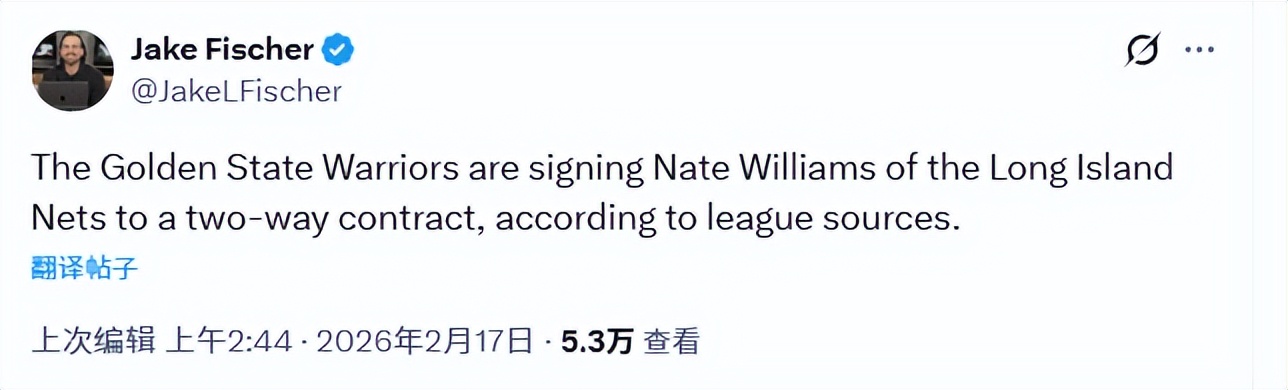 On February 17th Beijing time, NBA reporter Fischer revealed that the Warriors are set to ink Nate Williams to a two-way deal.