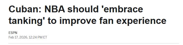On February 18th Beijing time, Mark Cuban openly supported NBA tanking. The ex-Mavericks owner believes the NBA should "accept tanking," primarily for the sake of the fan experience.
