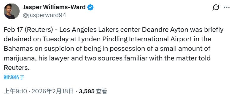 On February 18th Beijing time, his lawyer and two insiders confirmed to Reuters that Los Angeles Lakers center Deandre Ayton was briefly detained today at Lynden Pindling International Airport in the Bahamas on suspicion of carrying a small amount of marijuana.