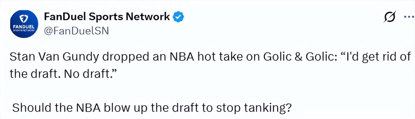 On February 19th Beijing time, the NBA is clearly displeased with teams tanking for draft picks, and Stan Van Gundy believes the solution is to abolish the draft altogether.