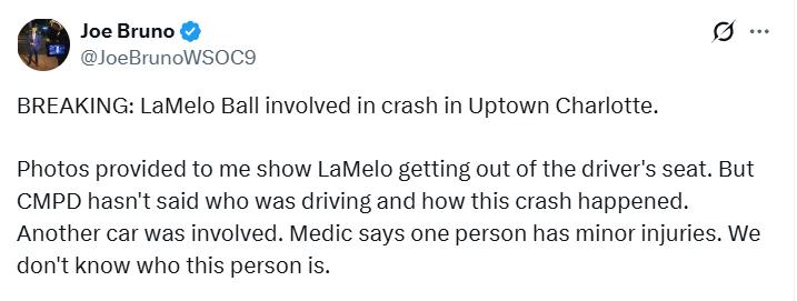 On February 19th Beijing time, according to reporter Joe Bruno, Hornets star LaMelo Ball was involved in a car accident in downtown Charlotte. Witnesses claimed Ball exited a Hummer and entered a Lamborghini, seeming unharmed. Medical reports confirmed one person suffered minor injuries.