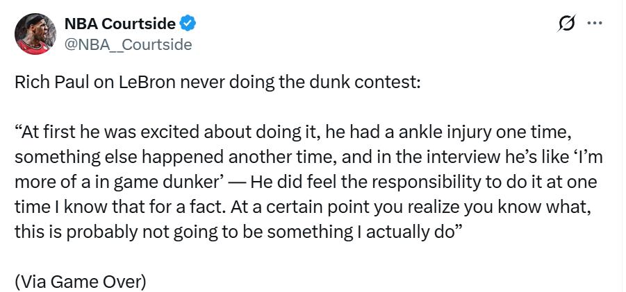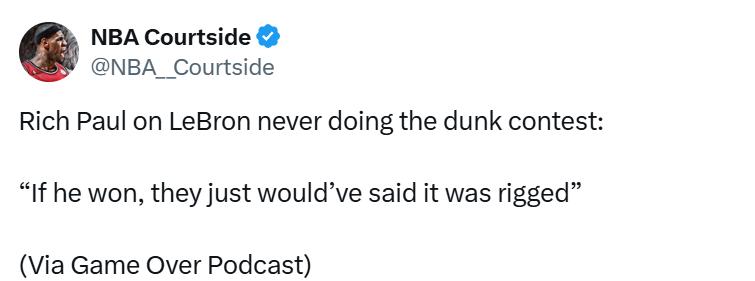 On his “Game Over” podcast, Rich Paul boldly claimed that if James had actually competed and won the dunk contest back then, the public reaction would have been negative. “If he won, people would just say the competition was fixed,” Paul said.