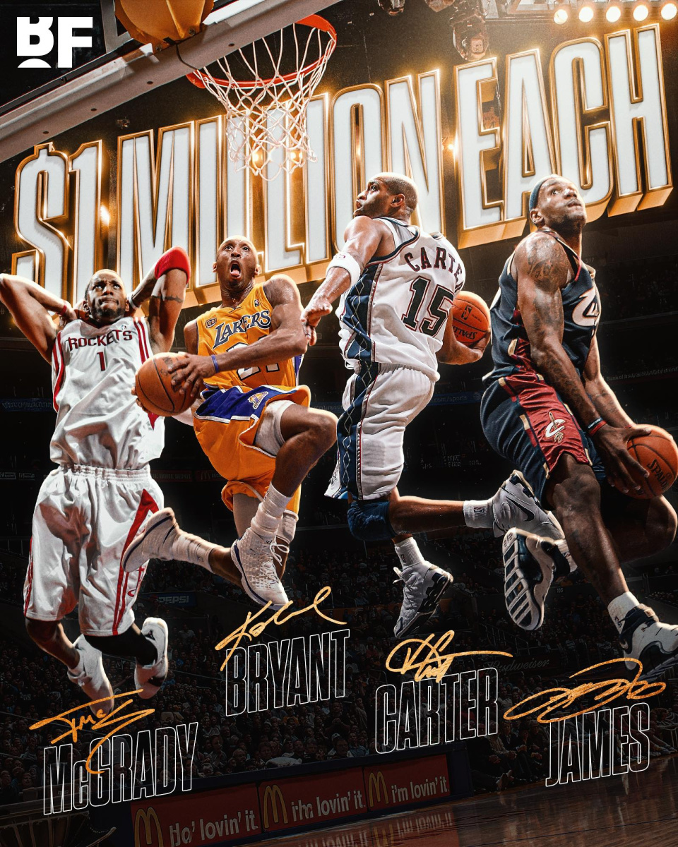 The NBA once offered $1 million to bring together James, Carter, Kobe Bryant, and Tracy McGrady for a dunk contest showdown, but it never happened. Carter said he was the only one among them willing to participate, making it a huge missed opportunity to see all four compete together.