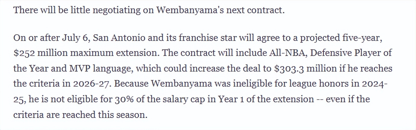 Because Vembanyama is ineligible for league awards in the 2024-25 season, even if he meets the criteria this year, his salary in the first year of the extension cannot exceed 30% of the salary cap.