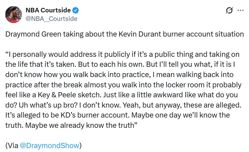 “So if it were me, I would respond publicly. But everyone handles things differently. Honestly, if it really is his alternate account, after the All-Star break when they return to training and enter the locker room, the scene would probably be extremely awkward and the atmosphere off. Of course, these are just rumors for now, only suggesting the account might belong to Durant. Maybe one day we’ll learn the truth, or maybe we already know it—who knows.”