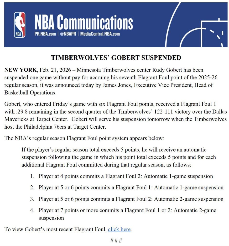 On February 22nd Beijing time, NBA Executive Vice President of Basketball Operations James Jones declared that Minnesota Timberwolves center Rudy Gobert was suspended for one game without pay due to reaching his 7th flagrant foul point in the 2025-26 regular season. This 33-year-old interior player will forfeit $201,149 in salary, and the Timberwolves will receive a luxury tax reduction of $100,575.