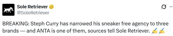 It is reported that Curry has narrowed his sneaker brand candidates to three, with Anta included.