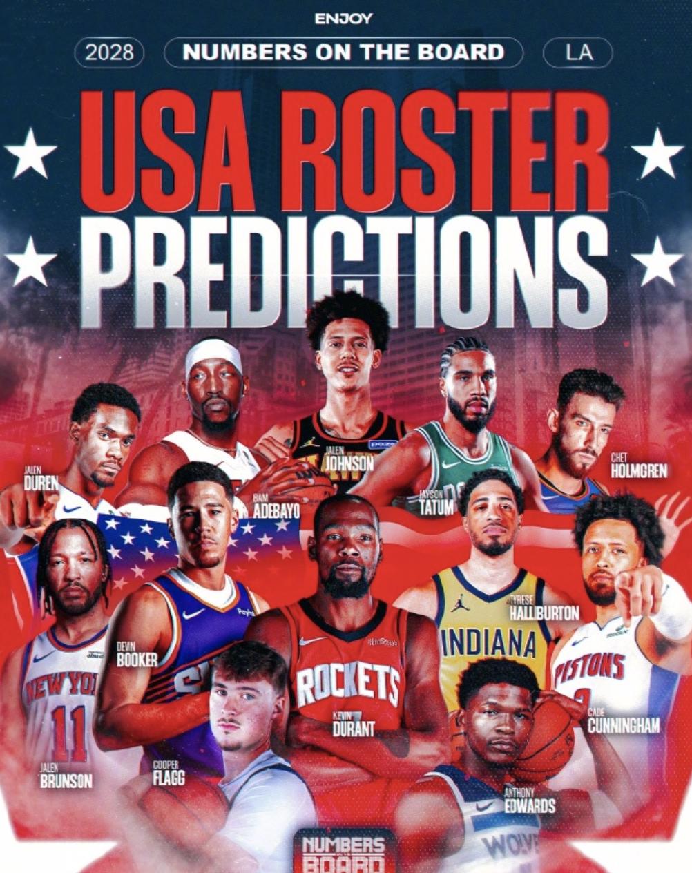 American media have predicted the 2028 Los Angeles Olympic basketball roster to include: Duren, Adebayo, Johnson, Tatum, Chet, Brunson, Booker, Durant, Haliburton, Cunningham, Flagg, and Edwards.