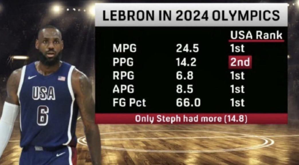 At the 2024 Paris Olympics two years ago, LeBron was in total command, serving as the U.S. flag bearer at the opening ceremony and earning the title of the best player on Team USA. He led the team with an average of 24.5 minutes per game, ranked second with 14.2 points per game, topped the team with 6.8 rebounds per game, led with 8.5 assists per game, and had the highest shooting percentage at 66%.