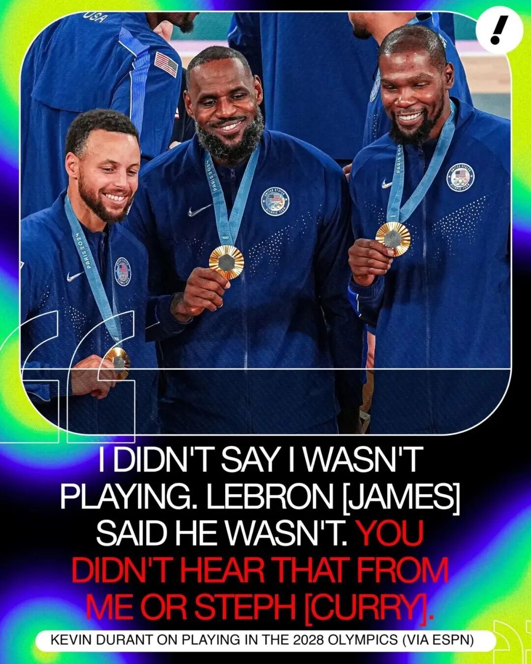 However, today NBA reporter Vincent Goodwill revealed that Durant expects to represent Team USA at the 2028 Los Angeles Olympics. When asked about the notion that the 2024 Paris Olympics was the final dance for LeBron, Durant, and Curry, Durant responded: