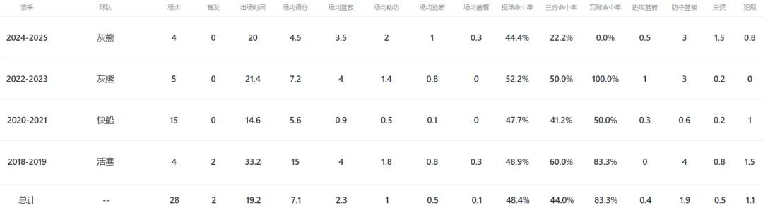 Historical data shows that in the intense playoffs, Kennard can still maintain exceptionally high shooting efficiency. To date, he has played playoffs for the Pistons, Clippers, and Grizzlies, averaging 19.3 minutes per game with 7.1 points, 2.3 rebounds, and 1 assist, hitting 1.4 three-pointers per game at a 44% shooting rate. The only drawback is that his output isn't very high.